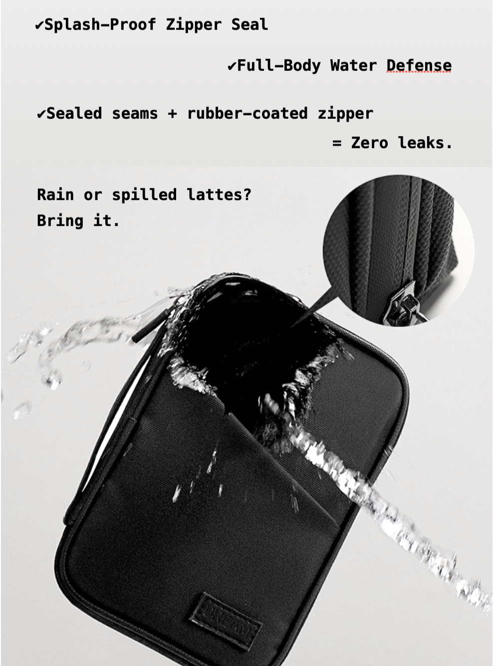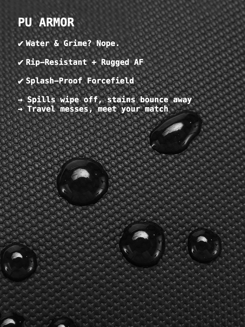 “BOARDROOM-ARMOR” PU SHELL → Coffee spills? Crumbs? Flight chaos? Deflects with a polished smirk. Wipes clean, scoffs at scuffs.